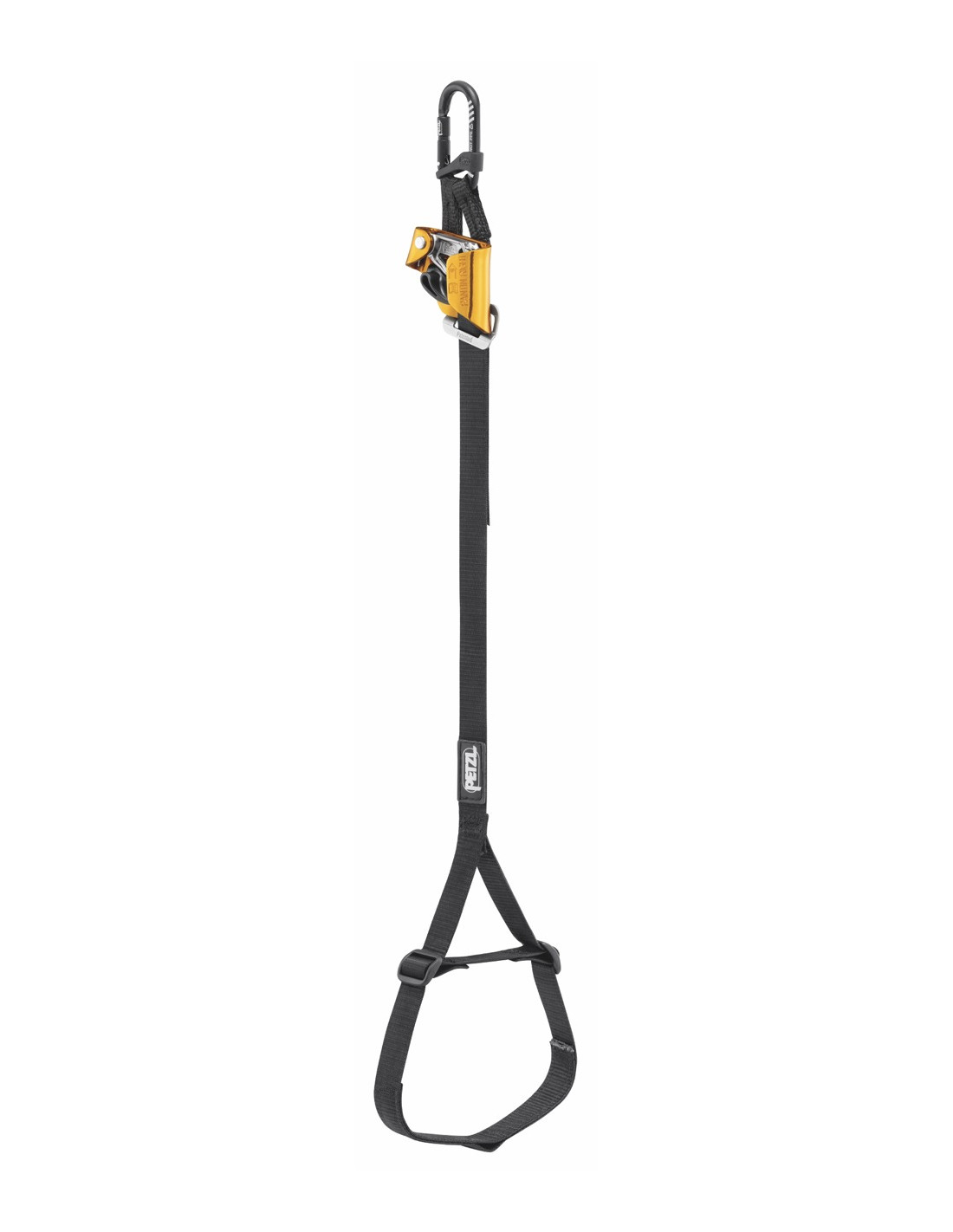 L’ensemble comprend un bloqueur PANTIN droit associé à une pédale textile réglable. La sangle inférieure permet un ajustement précis sur la chaussure, tandis qu’un point de connexion supérieur peut être utilisé avec un mousqueton type MINO (non fourni) pour une fixation optimisée.