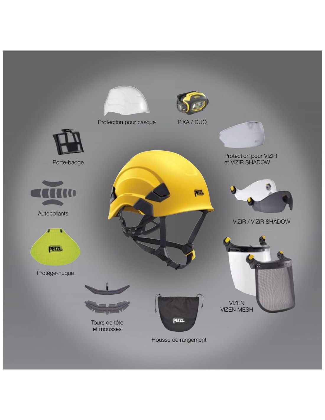 Entièrement compatible avec la gamme d’accessoires Petzl (VIZIR, VIZIR SHADOW, VIZEN, protège-nuque, porte-badge, etc.),