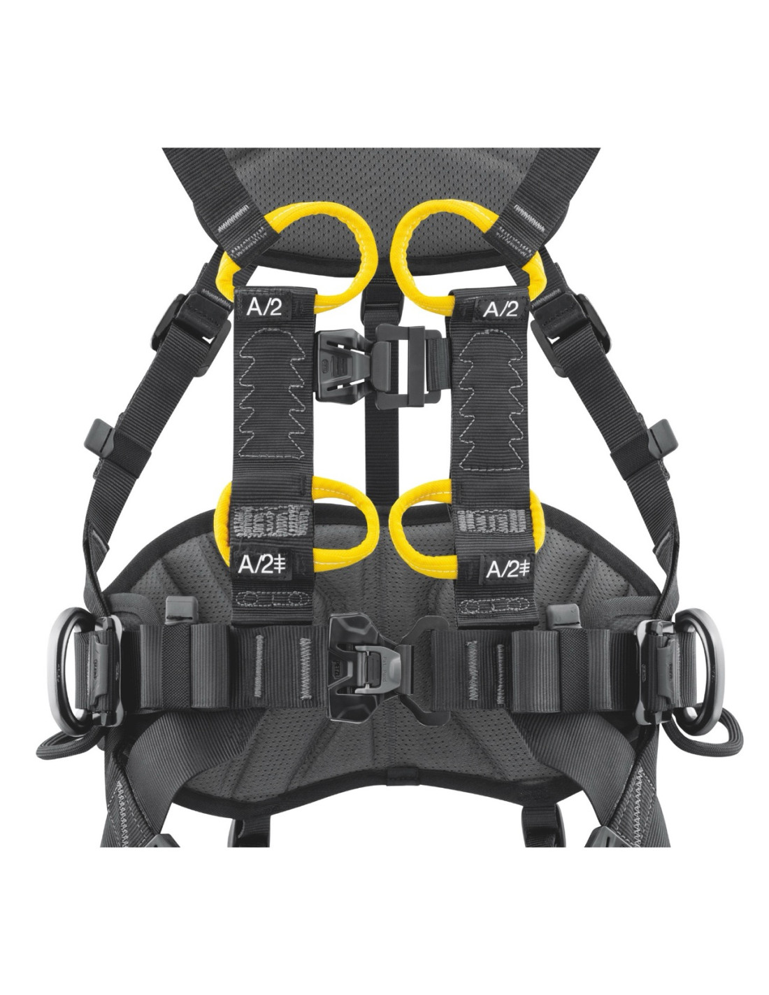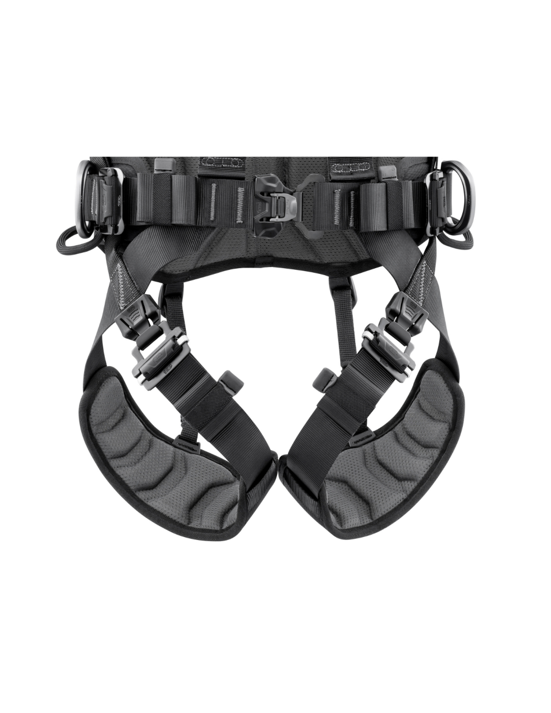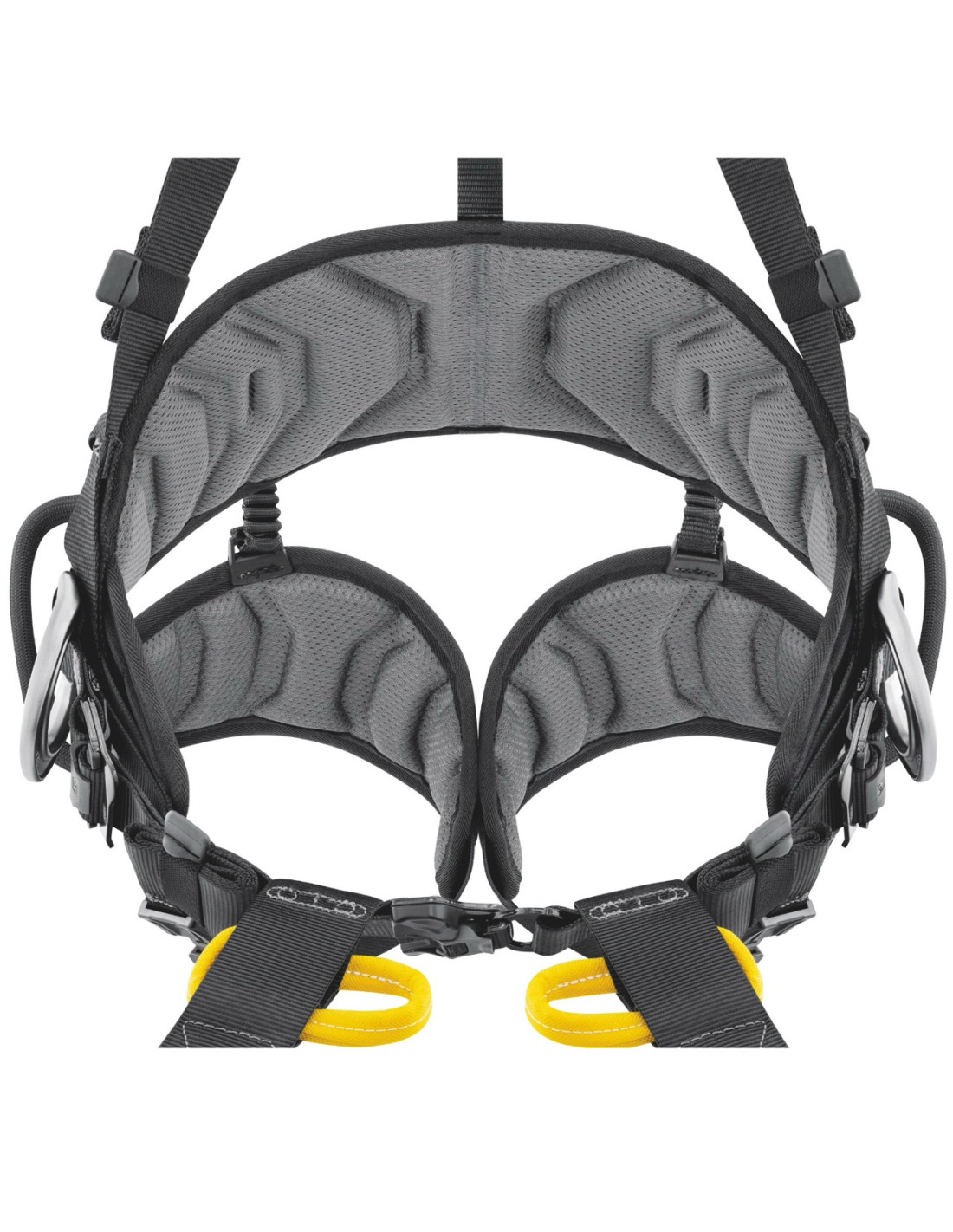 Toutes les zones de contact (bretelles, ceinture, tours de cuisse) sont équipées de mousses préformées respirantes, offrant un confort optimal même lors d’utilisations prolongées. Les renforts à l’arrière protègent les sangles contre l’usure liée aux déplacements dans les structures.
