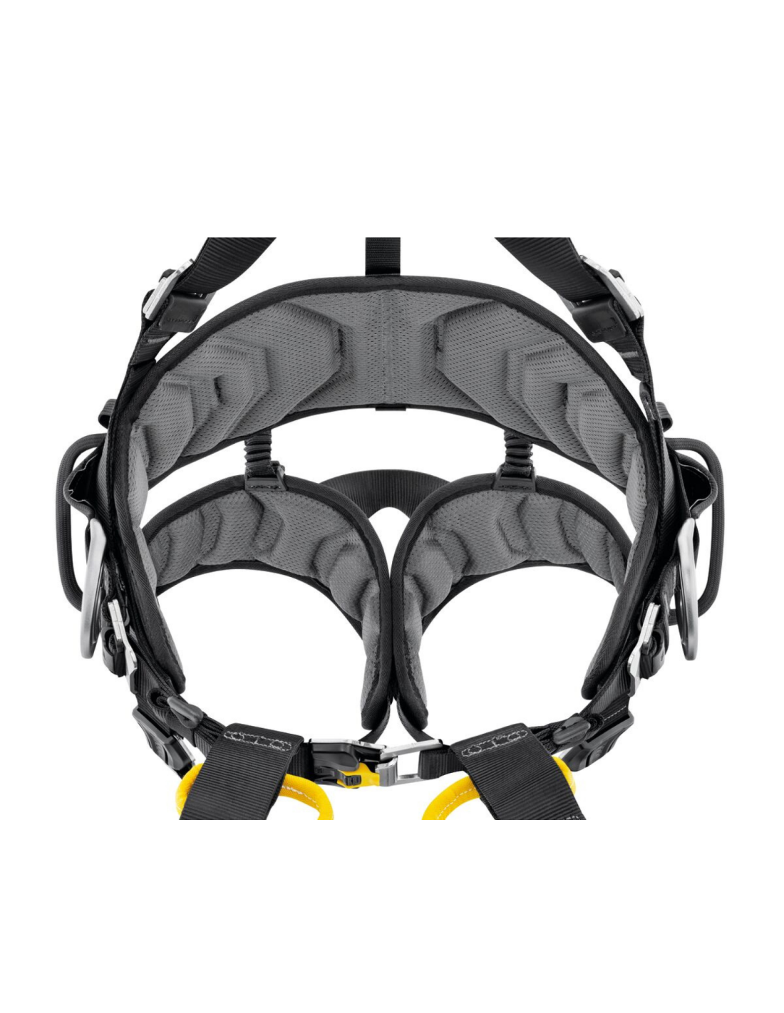 Le harnais intègre des plaques de protection à l’arrière des bretelles et de la ceinture, limitant l’usure liée aux frottements dans les structures d’éoliennes. Les zones de contact sont équipées de mousses préformées respirantes pour un confort maximal.