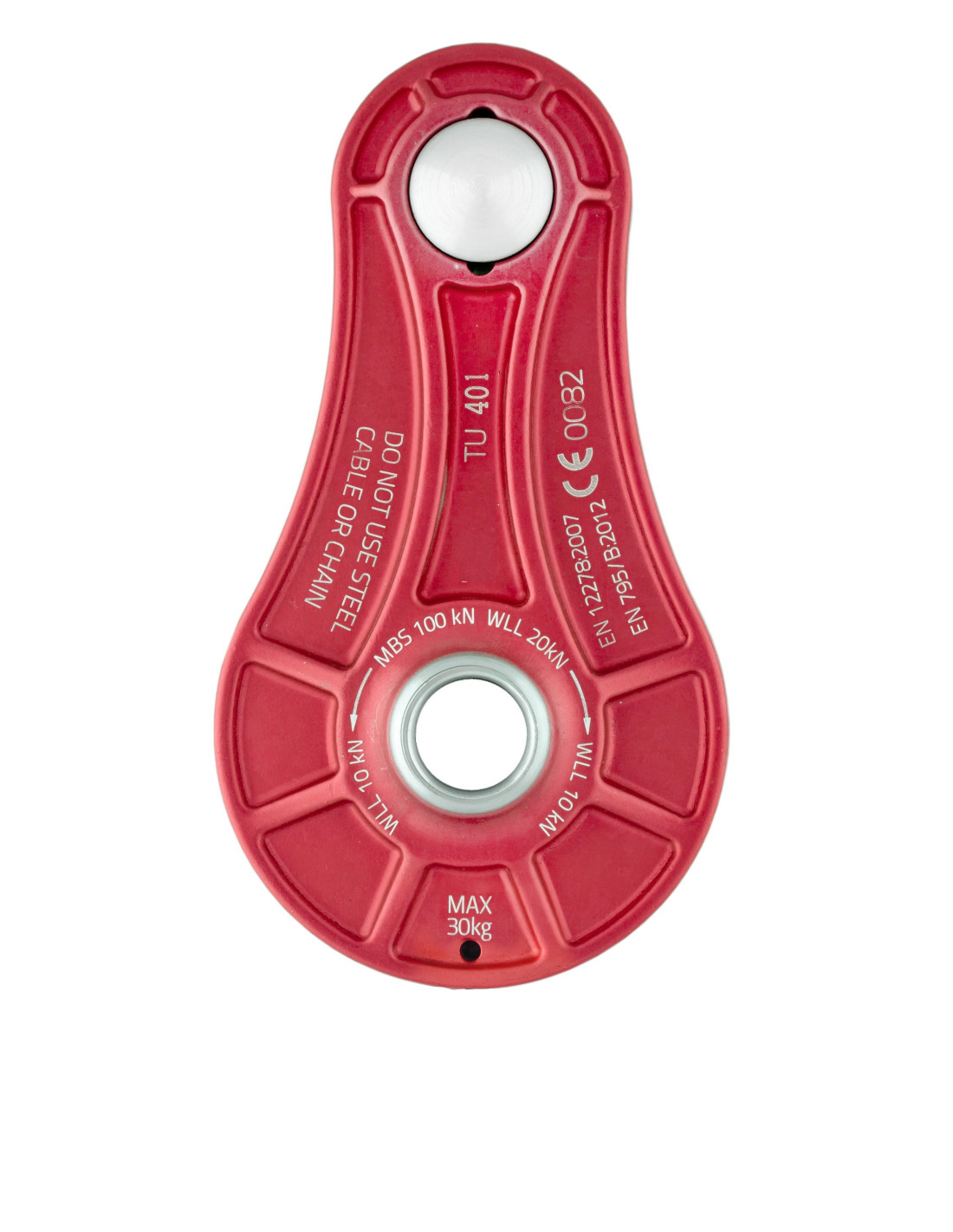 Compatible avec les cordes textiles jusqu’à Ø18 mm, elle offre une résistance de rupture de 100 kN et une charge de travail de 20 kN, avec un coefficient de sécurité 5:1.